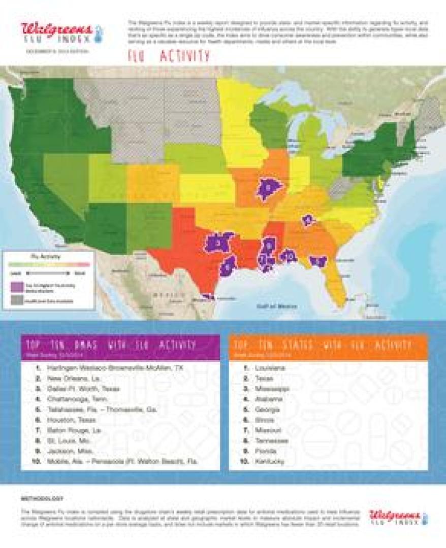 DEERFIELD, Ill., December 09, 2014 – The Walgreens Flu Index is a weekly report developed to provide state- and market-specific information regarding flu activity, and ranking of those experiencing the highest incidences of influenza across the country. With the ability to generate hyper-local data that’s as specific as a single zip code, the Index aims to drive consumer awareness and prevention within communities, while also serving as a valuable resource for health departments, media and others at the local level.
