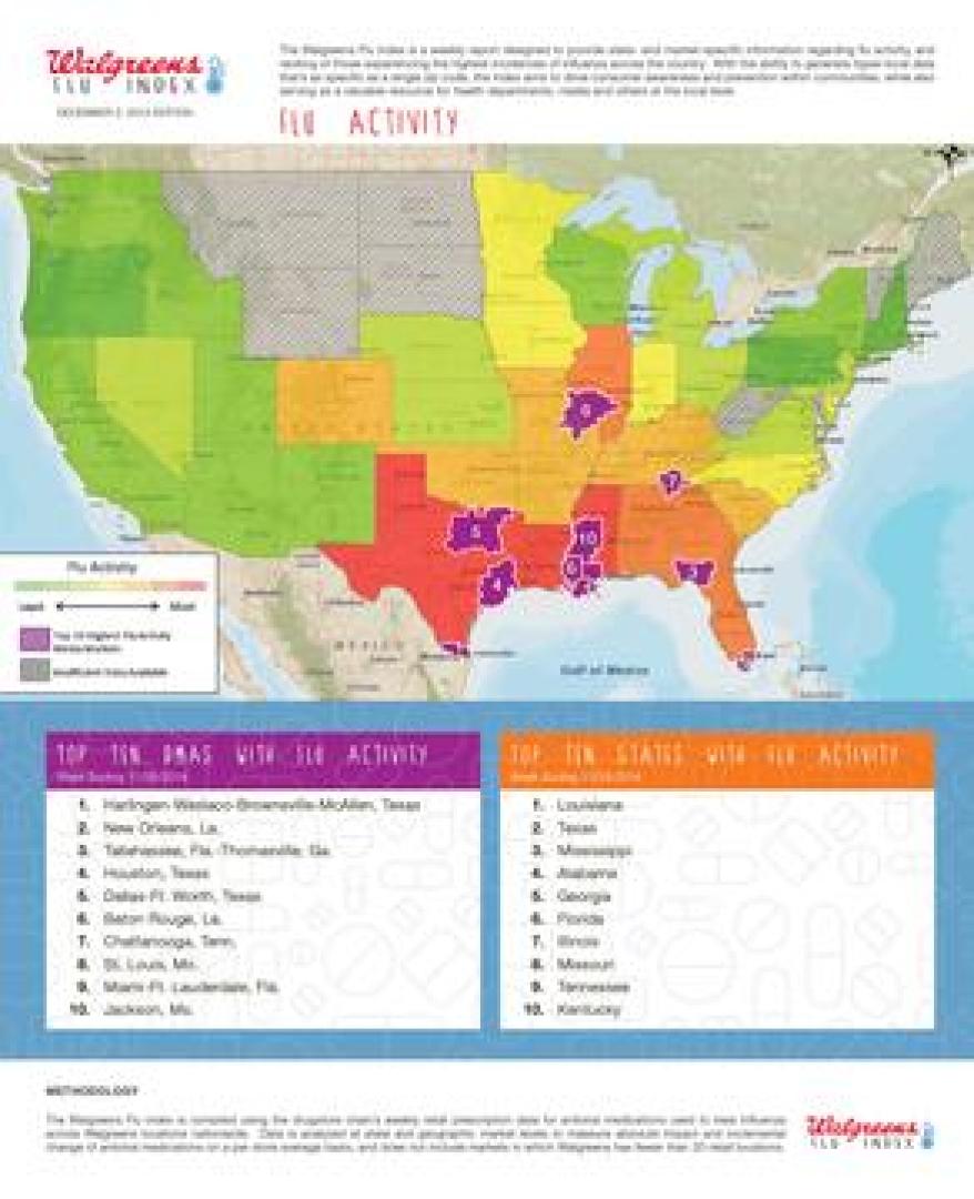 DEERFIELD, Ill., December 02, 2014 – With flu activity just beginning to rise in many parts of the U.S. in the midst of the busy holiday travel season, Walgreens (NYSE: WAG) (Nasdaq: WAG) today introduced its new Flu Index – a weekly report providing state- and market-specific information regarding influenza to help identify areas where flu cases may be escalating. The Index ranks markets and states experiencing the highest incidences of influenza across the country, as well as those showing the largest increases week-over-week.