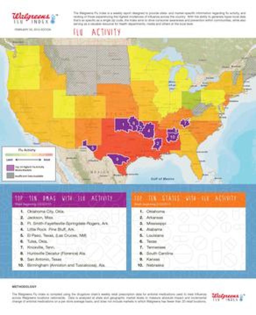 DEERFIELD, Ill., February 24, 2015 – The Walgreens Flu Index™ is a weekly report developed to provide state- and market-specific information regarding flu activity, and ranking of those experiencing the highest incidences of influenza across the country. With the ability to generate hyper-local data that’s as specific as a single zip code, the Index aims to drive consumer awareness and prevention within communities, while also serving as a valuable resource for health departments, media and others at the local level.