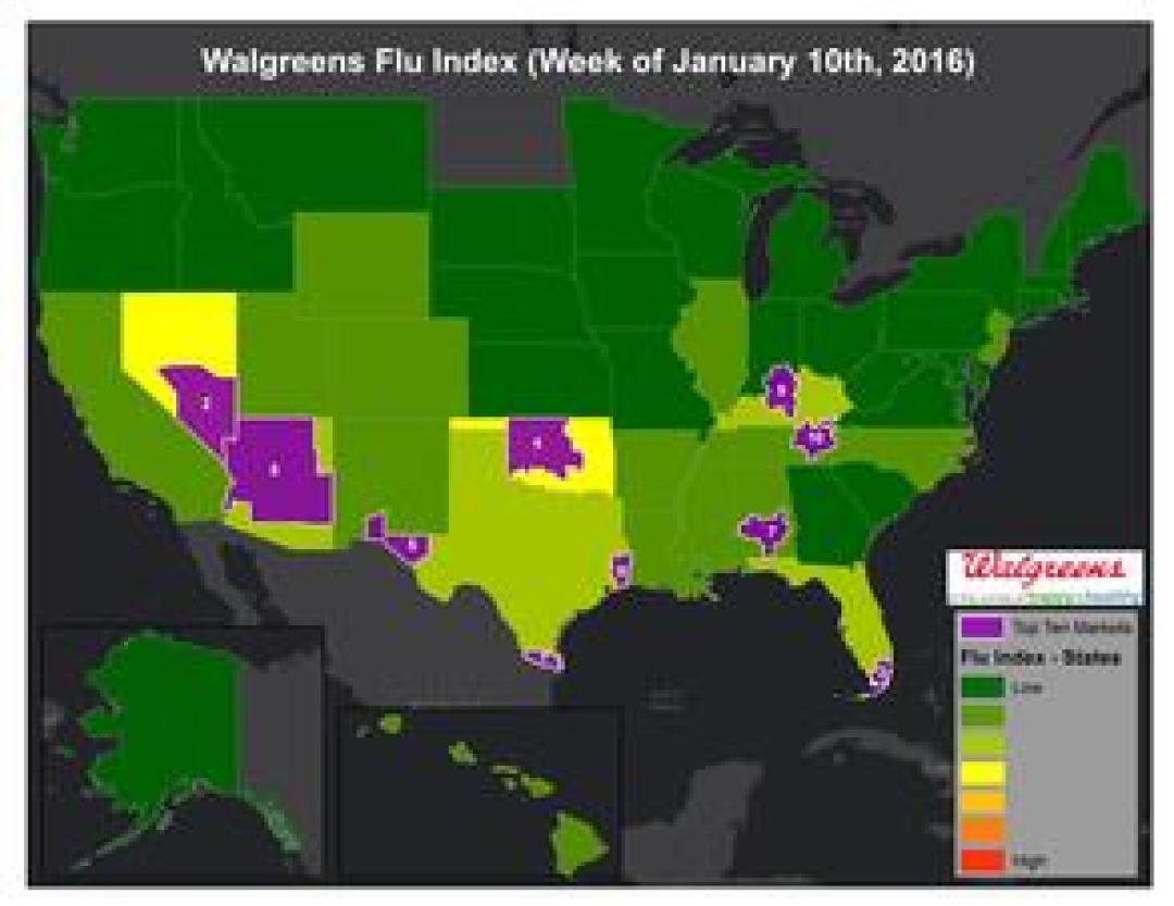 DEERFIELD, Ill., January 14, 2016 – The Walgreens Flu Index™ is a weekly report developed to provide state- and market-specific information, and ranking of those experiencing the highest incidences of influenza across the country. The Flu Index does not provide data measuring actual levels or severity of flu activity, but rather, illustrates which populations are experiencing the most incidences each week based on Index methodology.