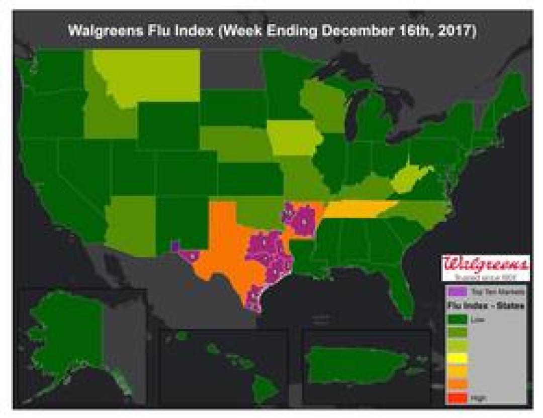 DEERFIELD, Ill., December 20, 2017 – The Walgreens Flu Index™ is a weekly report developed to provide state- and market-specific information regarding flu activity, and ranks those states and markets experiencing the highest incidences of influenza across the country.