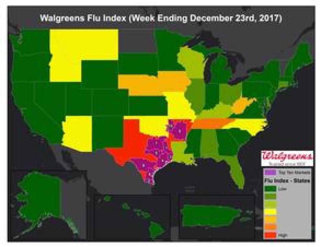 DEERFIELD, Ill., December 27, 2017 – The Walgreens Flu Index™ is a weekly report developed to provide state- and market-specific information regarding flu activity, and ranks those states and markets experiencing the highest incidences of influenza across the country.
