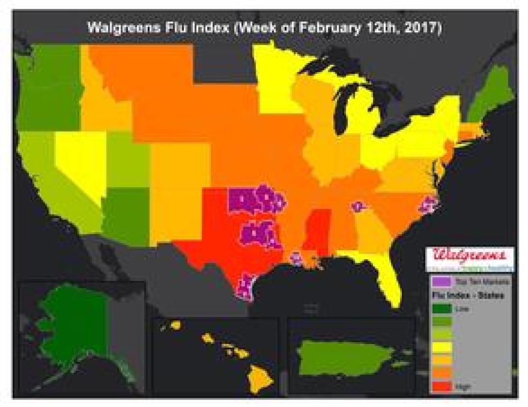 DEERFIELD, Ill., February 15, 2017 – The Walgreens Flu Index™ is a weekly report developed to provide state- and market-specific information regarding flu activity, and ranking of those experiencing the highest incidences of influenza across the country.