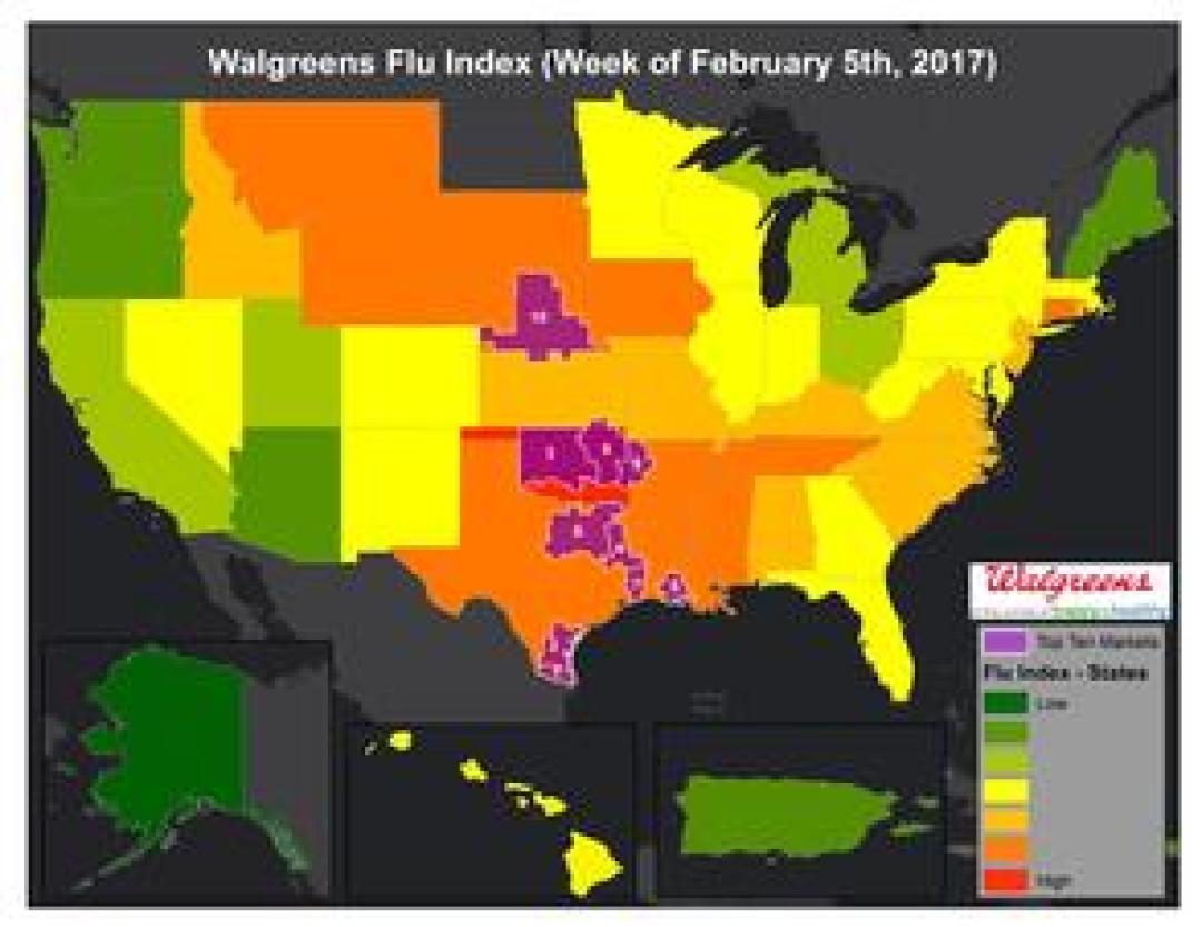 DEERFIELD, Ill., February 09, 2017 – The Walgreens Flu Index™ is a weekly report developed to provide state- and market-specific information regarding flu activity, and ranking of those experiencing the highest incidences of influenza across the country.