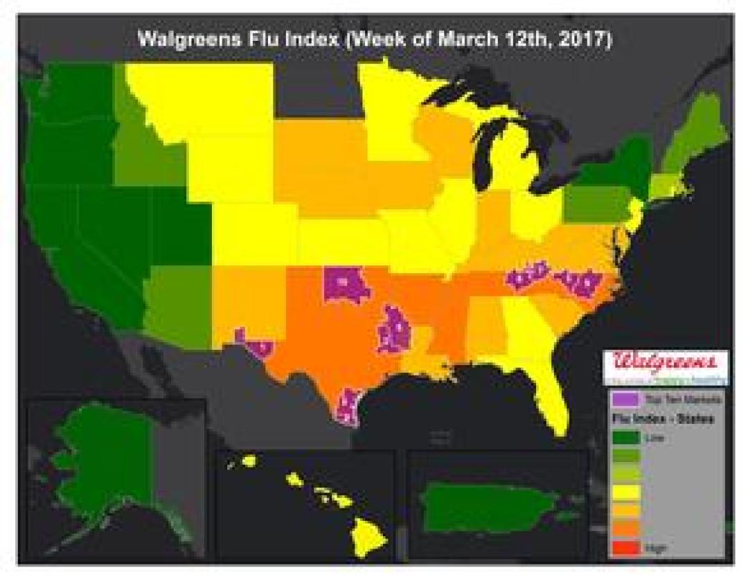 DEERFIELD, Ill., March 15, 2017 – The Walgreens Flu Index™ is a weekly report developed to provide state- and market-specific information regarding flu activity, and ranking of those experiencing the highest incidences of influenza across the country.