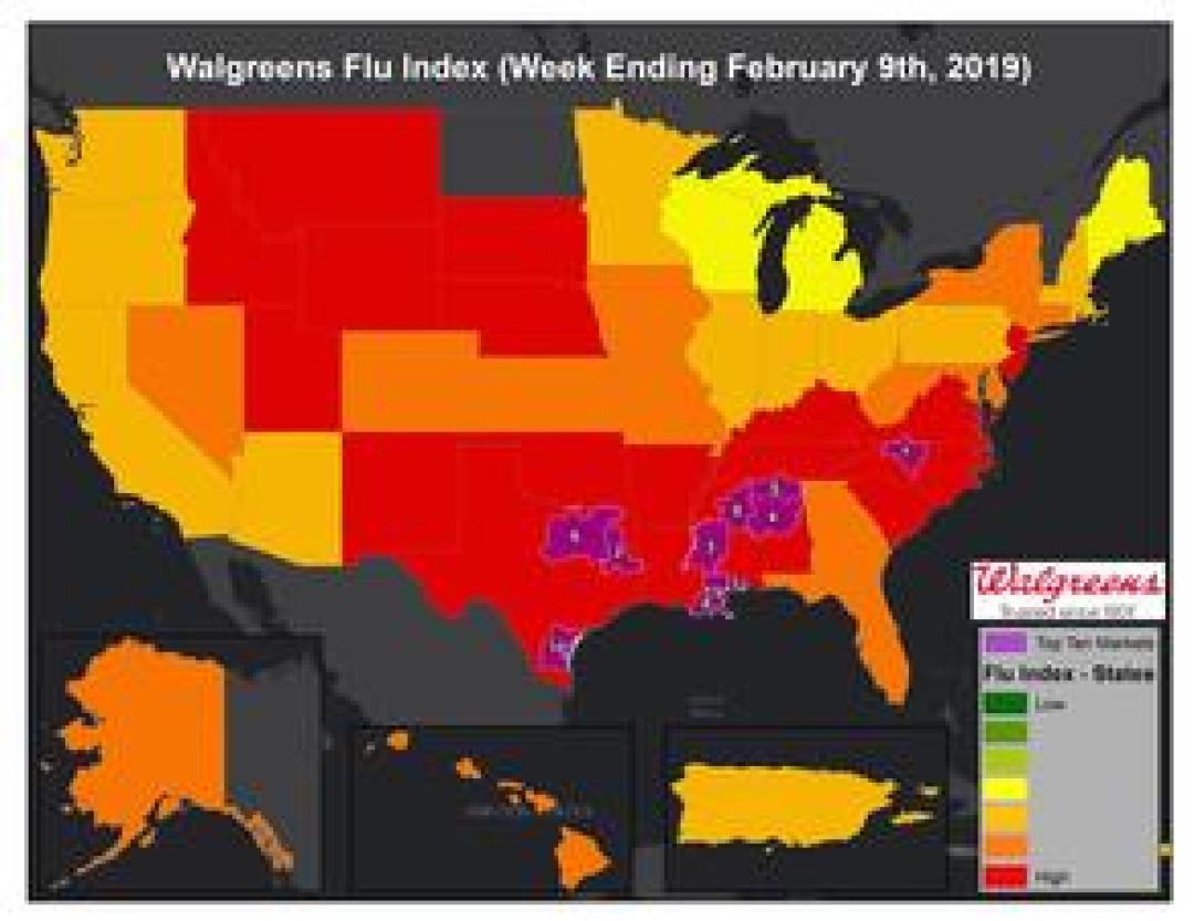 DEERFIELD, Ill., February 13, 2019 – The Walgreens Flu Index™ is a weekly report developed to provide state- and market-specific information regarding flu activity, and ranks those states and markets experiencing the highest incidences of influenza across the country.