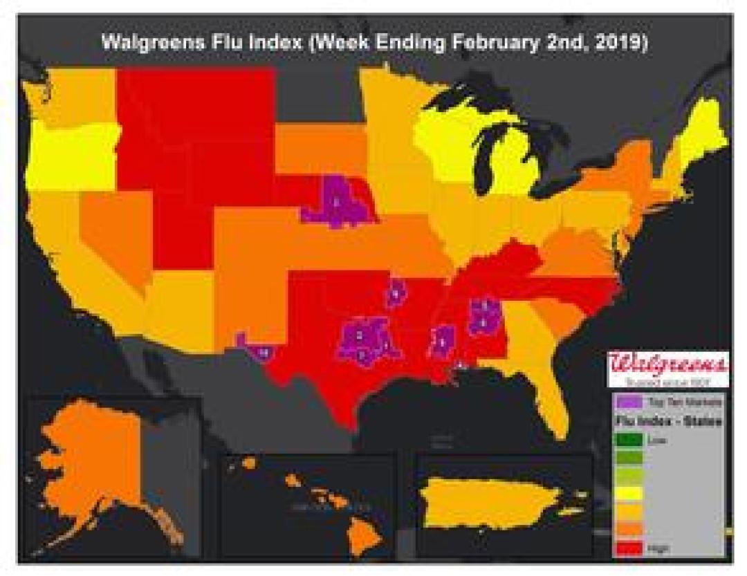DEERFIELD, Ill., February 06, 2019 – The Walgreens Flu Index™ is a weekly report developed to provide state- and market-specific information regarding flu activity, and ranks those states and markets experiencing the highest incidences of influenza across the country.