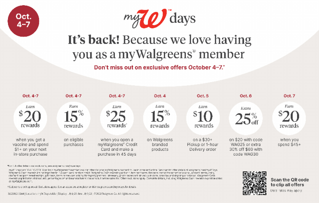 DEERFIELD, Ill., October 02, 2023 – Walgreens is hosting a myW days member exclusive event October 4 through October 7 offering extraordinary bonus offers and Walgreens Cash rewards instore and online. Members can start clipping offers now to their myWalgreens account online at walgreens.com/mywdays.
