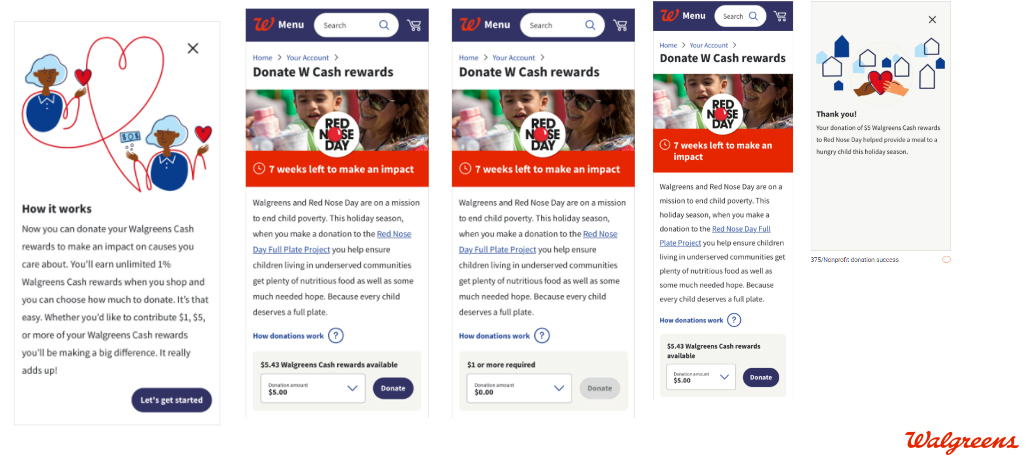 “We did some research on what customers might want to do with their Walgreens Cash rewards besides redeeming it. What else could customers do with it?” says Michelle Goydan, associate manager for brand marketing at Walgreens. “When we got the research back, it turned out that a lot of people were interested in donating it … which wasn’t a surprise considering how generous our customers have been historically when it comes to supporting charity partners like Red Nose Day. This was a great opportunity for them to join us as we continue supporting local communities together.”
