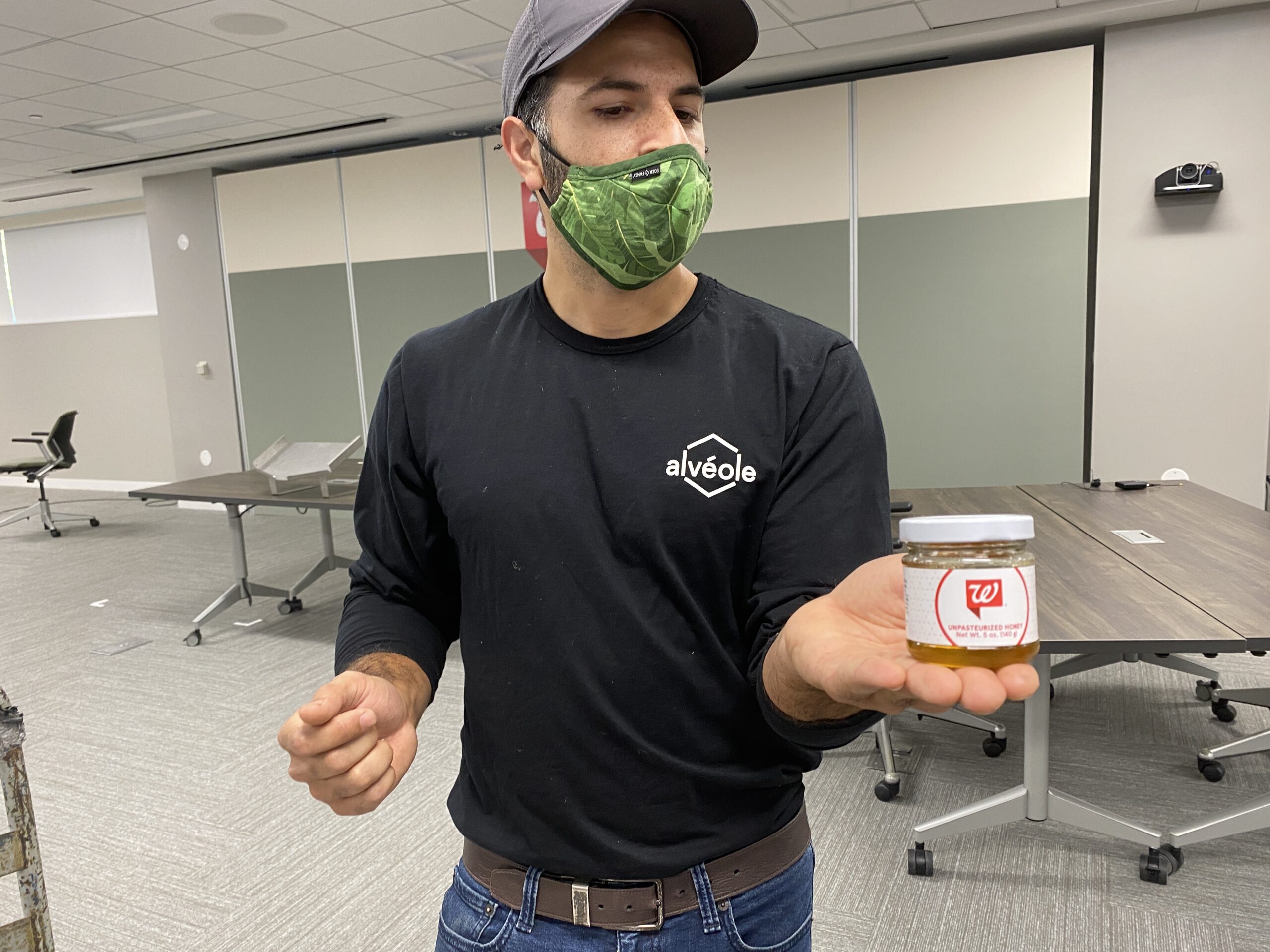 Alex Ansari, of Alveole, prepares one of the more than 60 jars of honey collected from this year’s harvest.
