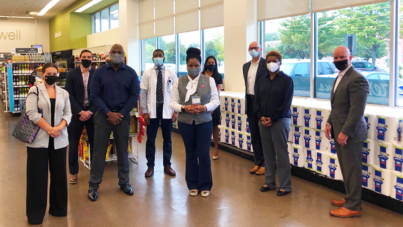 Walgreens leaders visit the store as it reopens: Left to right: Senior director, specialty health solutions Alexandra Broadus, senior director of pharmacy operations Darem Dughri, Reggie Jones, pharmacy manager Stephen Fadowale, LaTrice Greene, senior director of business transformation Bonita Sen, Stephen Peterson and Scott Diveney.