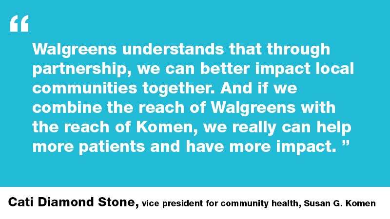 CDS: There are so many reasons why Walgreens is a strong partner. Walgreens understands that through partnership, we can better impact local communities together. And if we combine the reach of Walgreens with the reach of Komen, we really can help more patients and improve outcomes.