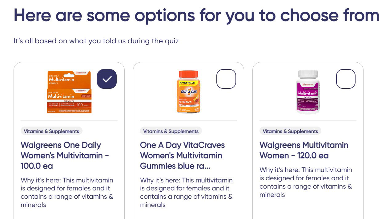 A screenshot from the Walgreens Vitamin and Selector Tool. The tool is accessible on Walgreens.com and the Walgreens app.“It was remarkable to see teams come together to openly share and celebrate their work,” says Todd Nemoir, vice president of Customer Digital Products & Platforms. “I continue to be amazed and excited about the outcomes these new features will drive for our customers, patients and team members.”