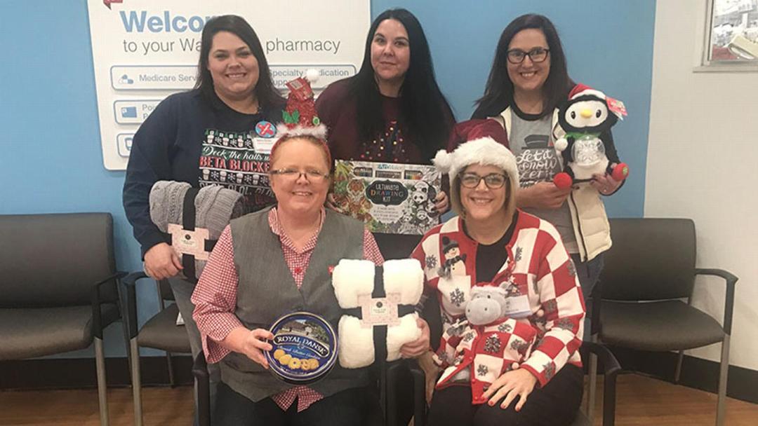 Walgreens team members in Lawrenceburg, Tenn., hold a sampling of items they’ve bought for local seniors this season. Front row, from left: store manager Stephanie Collins and pharmacist Janet Pamasa. Back row, from left: pharmacist Neshia Newton, shift lead Amanda Andler and pharmacy technician Jasmine Jones.
