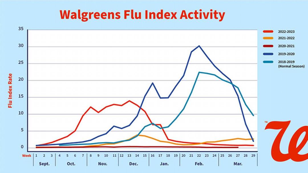 But that second wave never came—just one of a few oddities tracked during the 2022-23 flu season. In fact, it was the first time in Walgreens surveillance history, which began in 2018, that the Walgreens Flu Index did not show a second wave of flu.