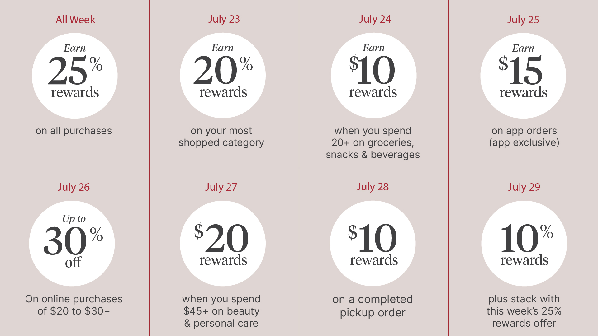 Walgreens Cash reward bonuses have never been higher and will be available all week, including: - Earn 25% Walgreens Cash rewards back on all purchases