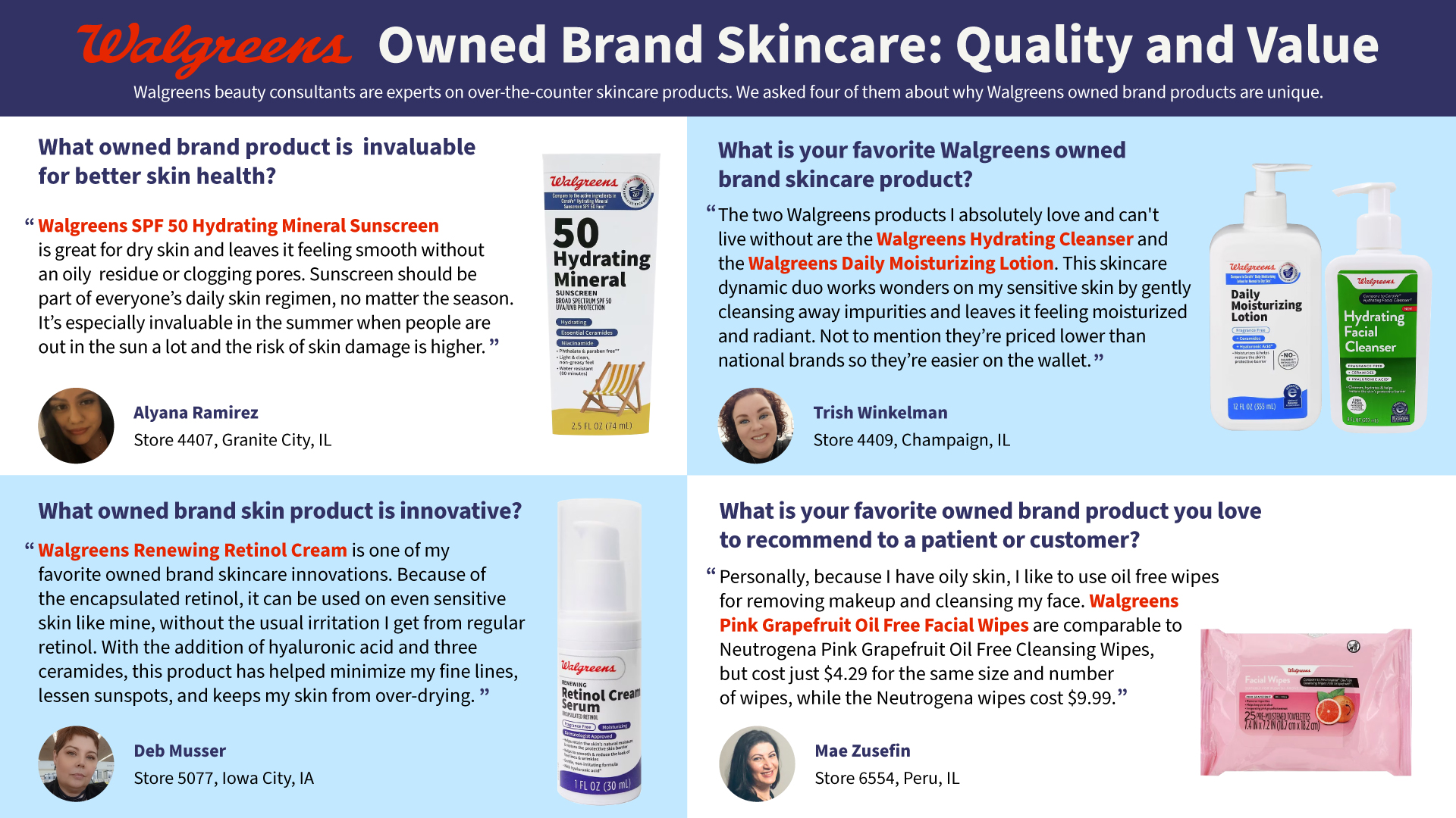 “When we say Walgreens is the premiere skin health destination, we’re talking about how we combine our unique advantages—our in-store pharmacists and beauty and skin consultants plus ongoing education and training and dermatologist-backed skin products, including our owned brands—and leverage them to be the most trusted source for information on skin health that customers and patients can find anywhere,” she says.